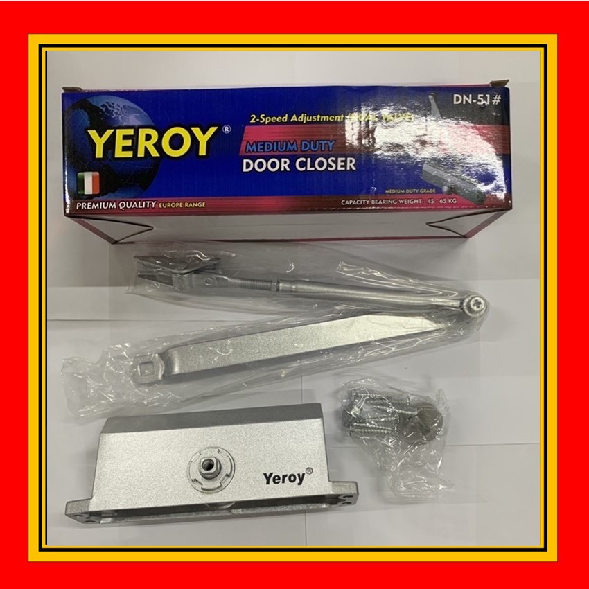 YEROY MEDIUM DUTY DOOR CLOSER - PREMIUM QUALITY EUROPE RANGE - 2-SPEED ADJUSTMENT (DUAL VALVE) MODEL : DN 51# MEDIUM DUTY GRADE DIMENSION : 162-19MM CAPACITY BEARING WEIGHT : 45-65KG PRODUCTS MATERIAL : ALUMINIUM ALLOY
